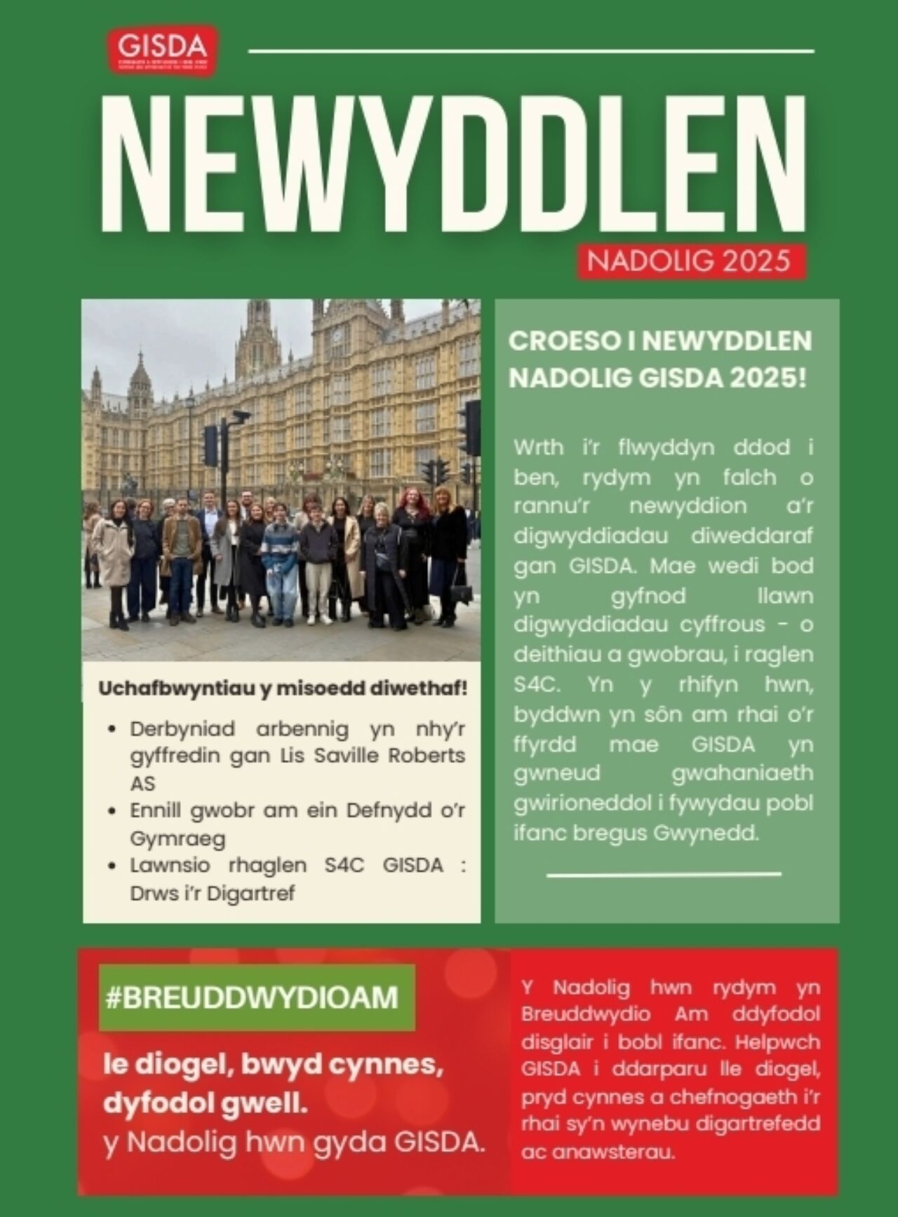 CROESO I NEWYDDLEN NADOLIG GISDA 2025! Wrth iโr flwyddyn ddod i ben, rydym yn falch o rannuโr newyddion aโr digwyddiadau diweddaraf gan GISDA. Mae wedi bod yn gyfnod llawn digwyddiadau cyffrous - o deithiau a gwobrau, i raglen S4C. Yn y rhifyn hwn, byddwn yn sรดn am rhai oโr ffyrdd mae GISDA yn gwneud gwahaniaeth gwirioneddol i fywydau pobl ifanc bregus Gwynedd.ย